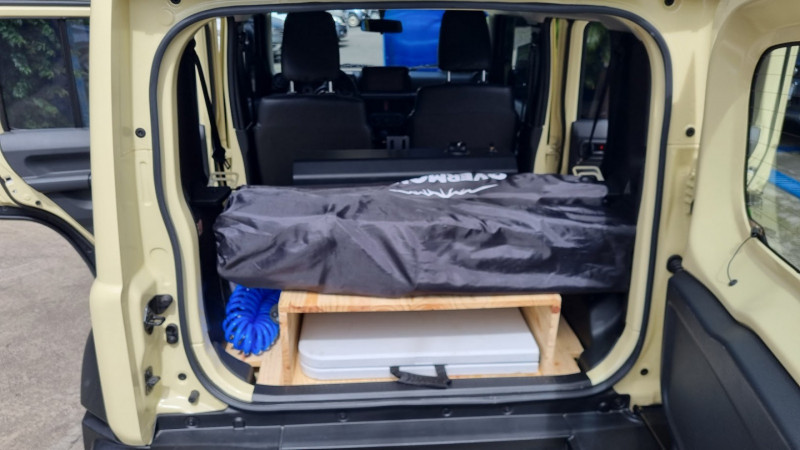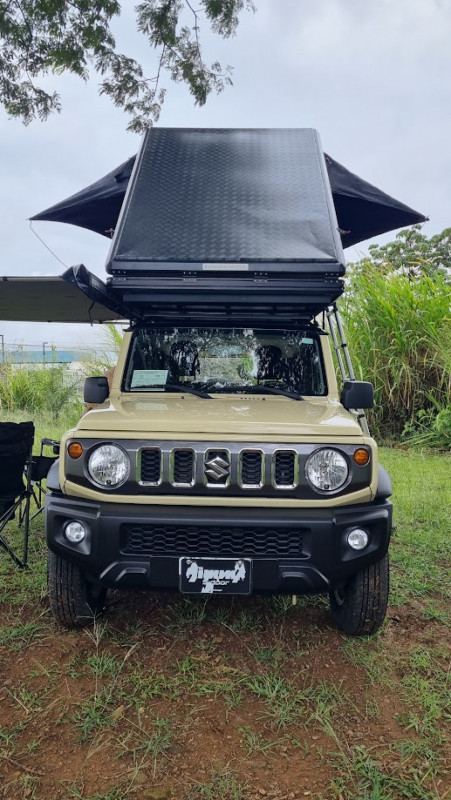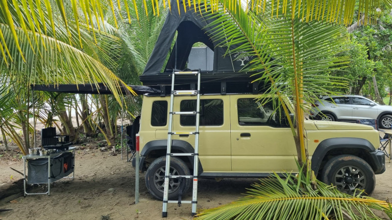 Notre SUZUKI JIMNY 4-door 4x4(Model year 2023) est le meilleur compact toit-camper pour des vacances inoubliables dans la jungle et sur la plage et partout où vous voulez aller. La Tente de toit de haute qualité s’ouvre et se ferme en moins d’une minute! Les 2 sièges arrière sont remplacés par une armoire en bois, où vous pouvez stocker beaucoup de l’équipement. Un coffre métallique robuste pour ranger votre ordinateur portable et vos objets de valeur vous donne la sécurité. Bons pneus tout terrain et traction 4x4 avec réducteur vous amène partout. Réservoir d’eau en aluminium pressurisé avec 5 gal. et 6 m de tuyau et d’eau pour le lavage ou la vaisselle.