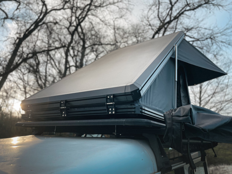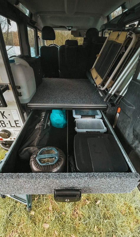 Son aménagement est plutôt simple: une configuration tiroir benne laissant place à un grand espace de rangement ainsi qu’une tente de toit alu (belle résistance au vent) toute équipée (isolation, éclairage led, anti condensation…).