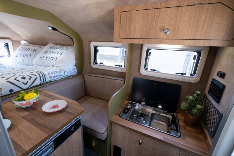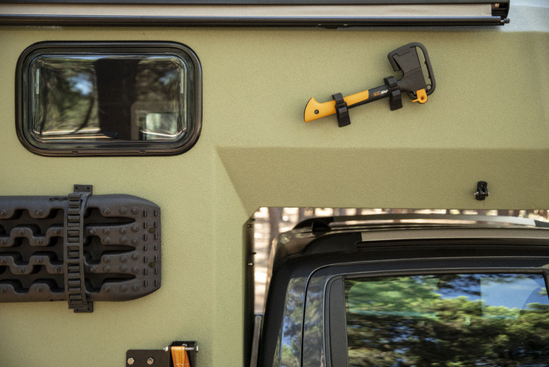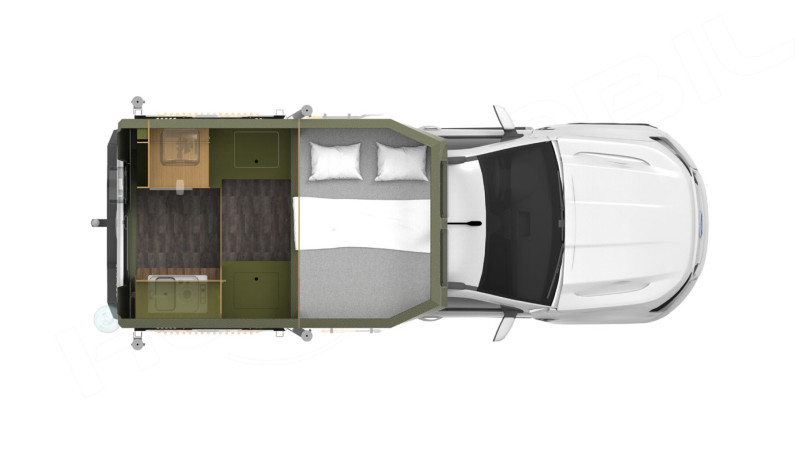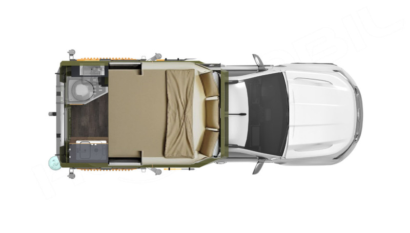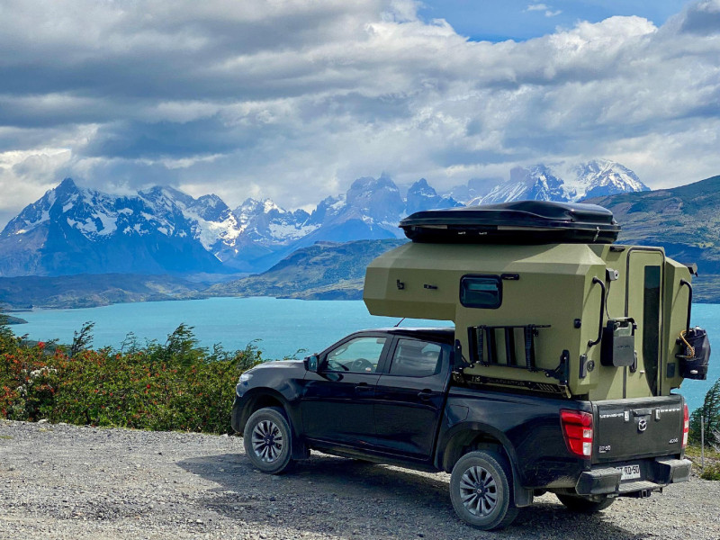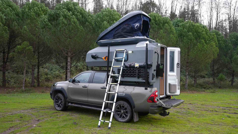 Le Gladiator Green de Uozi Campers est un Mazda BT-50 4×4 double cabine transformé en véritable maison tout-terrain. Équipé d’un moteur diesel 3,0 L de 188 ch et d’une boîte automatique, il allie puissance, confort et autonomie. Sa cellule monocoque intègre un grand lit double (ou king size), une cuisine complète avec réfrigérateur, cuisinière et évier, ainsi qu’une salle d’eau extérieure avec douche et toilettes portables. Le véhicule dispose également d’un chauffage au diesel, d’un panneau solaire, d’une batterie auxiliaire, d’eau chaude et de réservoirs d’eau propre (58 L) et d’eaux usées (23 L), garantissant un confort optimal même en pleine nature.