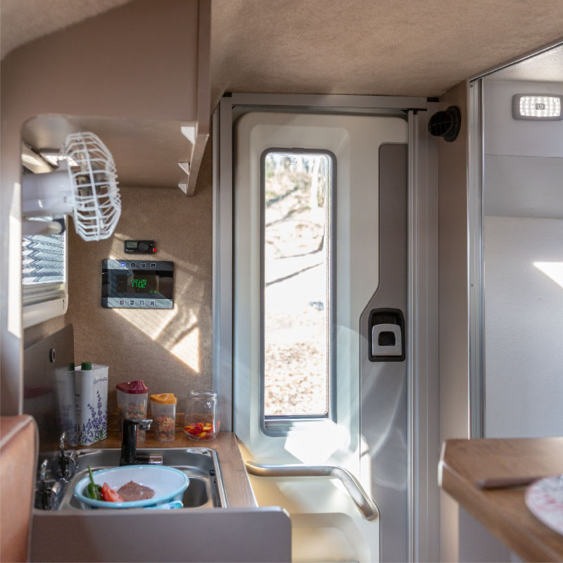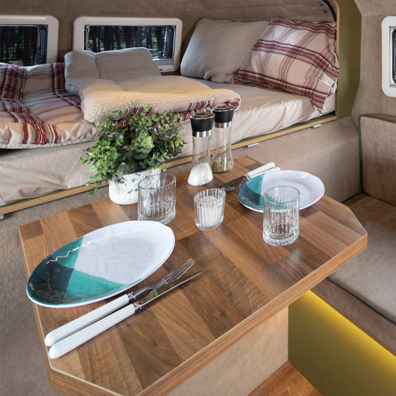 Il est possible d’y ajouter une tente de toit spécialement prévue pour héberger deux enfants, transformant le véhicule en un camping-car familial compact et polyvalent. De nombreuses options personnalisables permettent d’adapter les équipements selon les besoins et le style de voyage.
