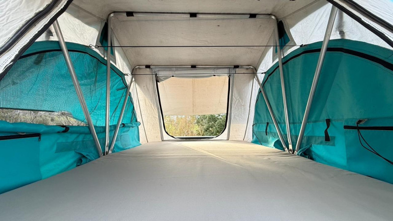 Équipé d’une tente de toit tout confort, il vous offre la liberté de bivouaquer où bon vous semble, sous un ciel étoilé méditerranéen. L’aménagement inclut tout le nécessaire pour un road trip en mode aventure : matelas confortable, espace de rangement, kit de cuisine et tout l’équipement outdoor essentiel.
