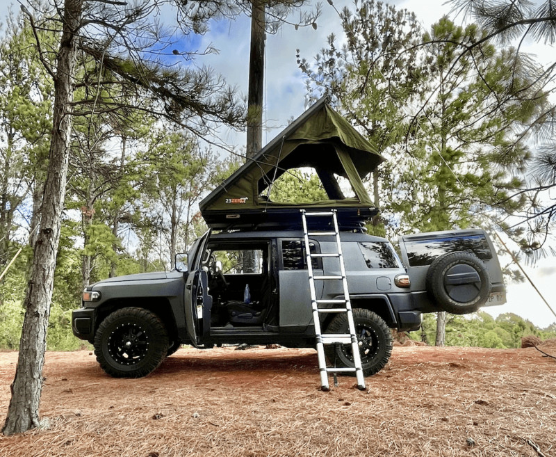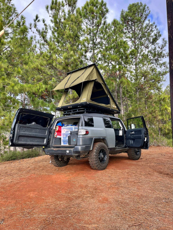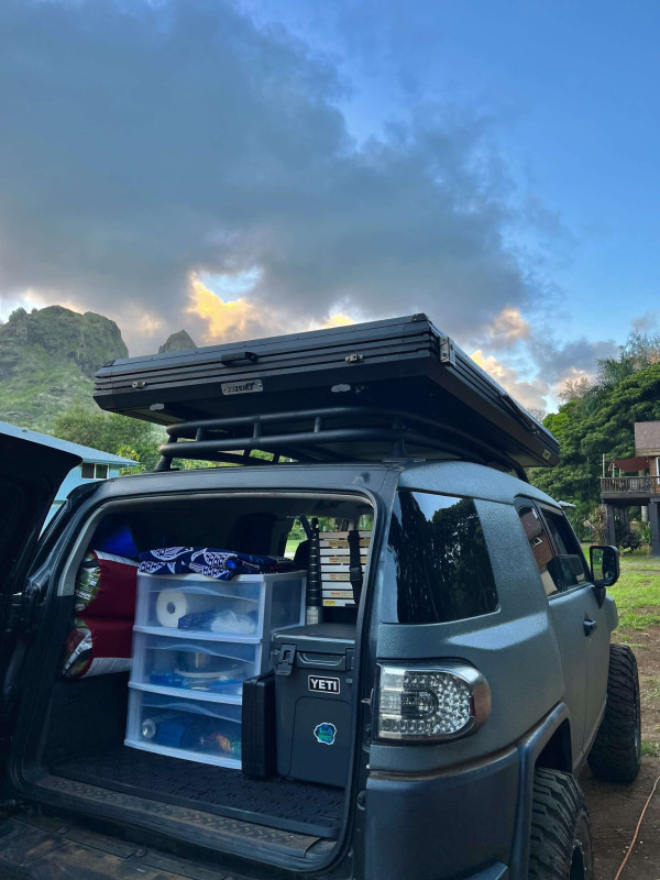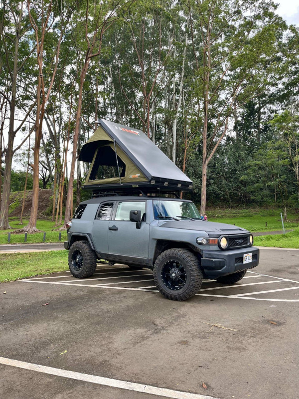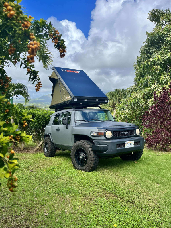 Aloha ! Voici une expérience 2-en-1 unique en son genre pour explorer l’île ! Profitez de la manière la plus authentique de visiter Kauai avec le seul FJ Cruiser gris mat entièrement équipé de l’île ! Après votre réservation, nous vous fournirons un guide fait maison, fruit de nombreuses années d’expérience et d’exploration de Kauai. Ce guide inclut des emplacements de camping ainsi que des recommandations pour les repas, les randonnées et les excursions ! Vous voyagerez et camperez avec style grâce à ce FJ Cruiser au revêtement rhino gris mat et noir, doté de la transmission 4x4, d’un kit de rehaussement et de pneus de 33 pouces. Tout l’équipement de camping nécessaire est inclus, ainsi qu’une tente de toit rigide avec un matelas confortable ! Il faut avoir 21 ans minimum pour réserver.
