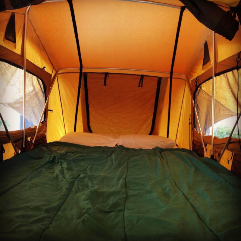 The Toyota Hilux RV with rooftop tent offered by Intorno is a 4×4 pickup fitted out for travel and camping, designed to explore wild regions with autonomy and comfort. Built on a rugged Toyota Hilux platform, it features a rooftop tent, allowing you to sleep directly on the vehicle—often with multiple sleeping spaces depending on the configuration. This vehicle can carry up to around five people while offering accommodation for roughly four sleepers, combining cabin space with an elevated sleeping area under the tent. It retains a manual transmission, a diesel engine suited to varied terrain, and air conditioning in the cab. The setup includes a camping kitchen with a stove and cooking equipment, storage solutions, an autonomous power supply, and bivouac gear so you can cook, rest, and organize your days out in nature. Overall, the Hilux RV combines genuine off-road capability with the practicality needed for overland adventures, with features built to handle demanding routes and nights under the stars.