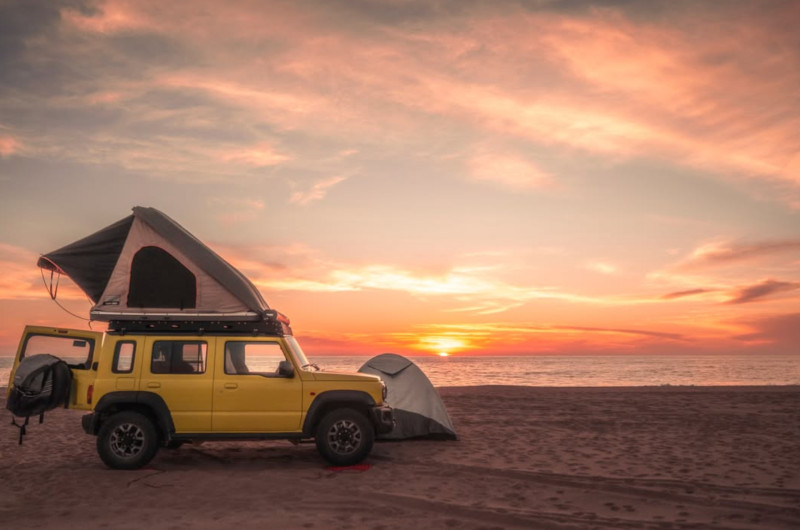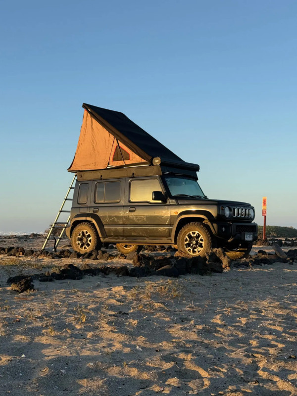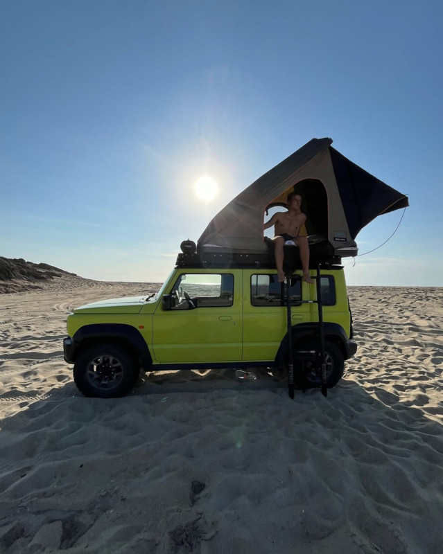 Compact, léger et étonnamment performant en tout-terrain, ce Suzuki Jimny 5 portes est une excellente option pour partir à deux à l’aventure tout en restant simple à prendre en main. Sa transmission automatique 4×4 permet de circuler facilement sur route comme sur les pistes, avec un véhicule maniable et fiable. L’installation de couchage se fait grâce à une tente de toit équipée d’un matelas (135×190 cm), idéale pour deux personnes. À bord, tout le nécessaire pour des escapades courtes et autonomes est déjà prévu : housse et drap pour le matelas, deux oreillers, auvent pour l’ombre, tapis de plage pour deux personnes, glacière rigide, douche de 26 L, bande LED pour l’éclairage, pelle, kit de premiers secours, kit d’assistance routière et kit de récupération. Compact et facile à vivre, ce Jimny convient particulièrement aux voyageurs solo ou aux couples qui souhaitent un véhicule capable pour découvrir les pistes sans s’encombrer. Il est cependant conçu pour un voyage léger, plutôt pour profiter des paysages et des chemins que pour rouler vite ou transporter de lourdes charges.
