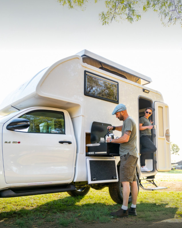 Le véhicule est bien équipé pour le camping : il comprend un réfrigérateur/congélateur de 40 L, une cuisinière à gaz (avec deux foyers – un intérieur et un extérieur) alimentée par une bouteille de gaz de 3 kg, un réservoir d’eau de 60 L, une douche extérieure à main et des installations pour l’eau chaude.