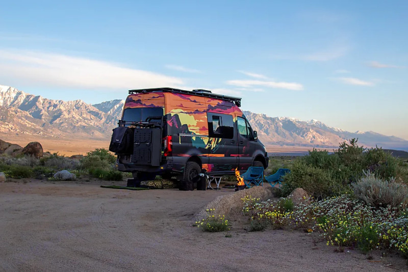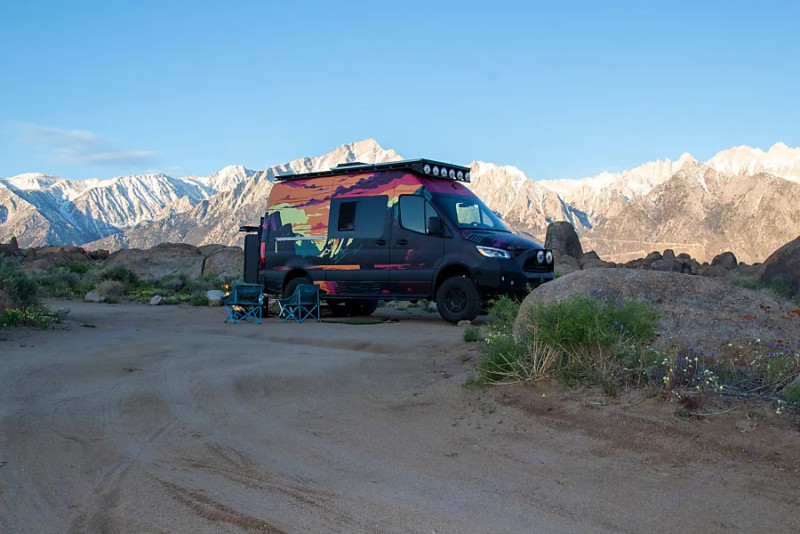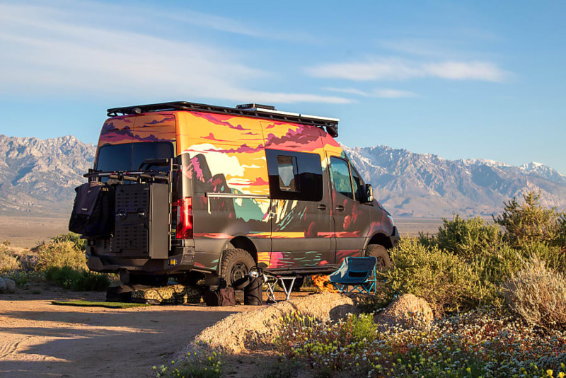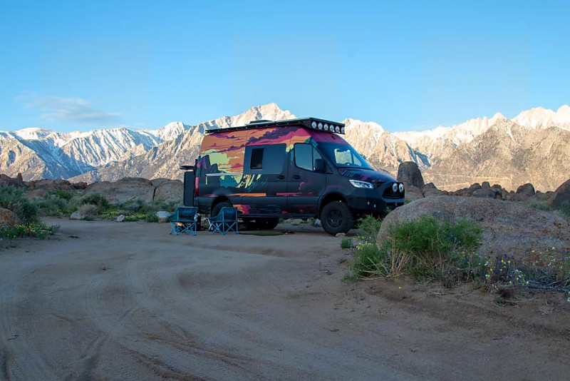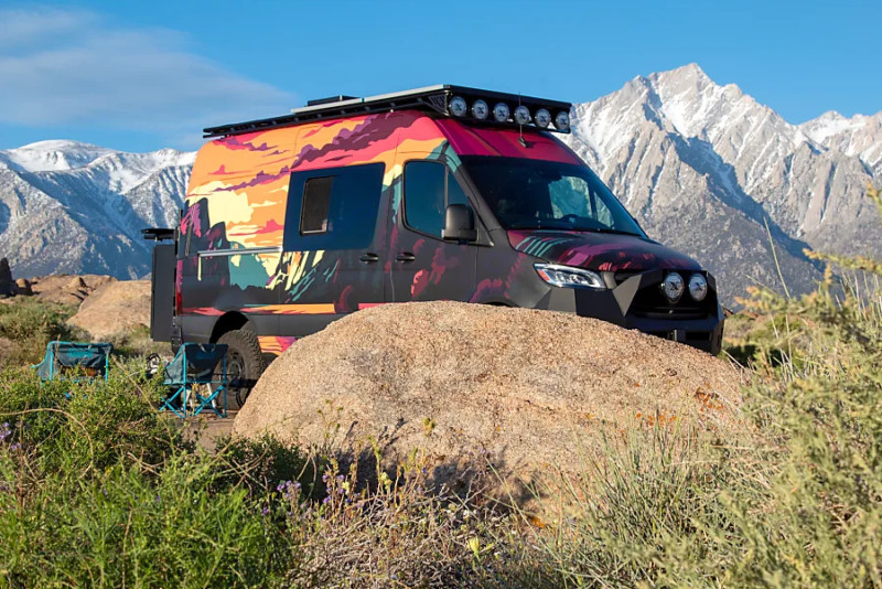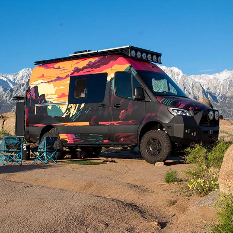 Available for rent is our 2023 Rogue Vans Custom Mercedes Sprinter, built on the Mercedes 144 AWD chassis w/ every premium option available. Our classic Summer build features a folding two person Freedman bench seat behind the Driver's captain chair, followed by a petite split kitchen and dueling benches that convert into a bed. Electrical is housed in the Passenger side bench, while water is housed in the Driver's side bench. This van is fully built out with a custom wrap, upgraded suspension, all-terrain tires, ample lighting for off-grid adventures and more. We spared no expense in setting this rig up for off-grid camping, with 500 watts of solar, 600 Amp hours of lithium batteries and a 37-gallon fresh water tank.