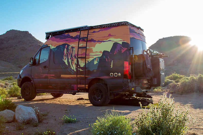 Ce van est entièrement aménagé avec un covering personnalisé, une suspension améliorée, des pneus tout-terrain et un éclairage optimal pour l’aventure en autonomie. Nous n’avons fait aucun compromis pour le camping hors réseau, avec 500 watts de panneaux solaires, 600 Ah de batteries lithium et un réservoir d’eau douce de 140 litres (37 gallons).